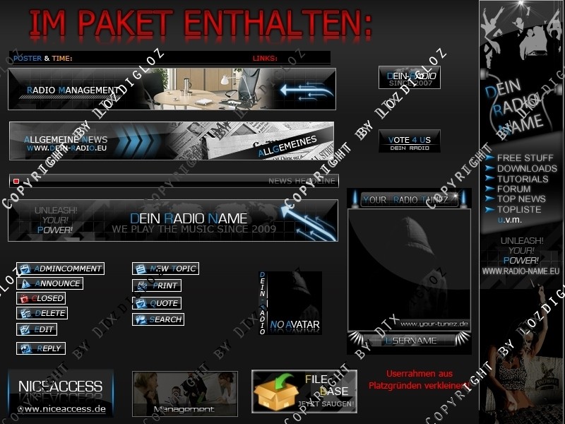 Hallo, biete Euch hier ein Radio Design der Extra Klasse an. Das ganze wird als XXL Paket verkauft, welches wirklich alles beinhaltet was man für ein erfolgreiches Webradio - zumindestens im Punkto Design benötigt.